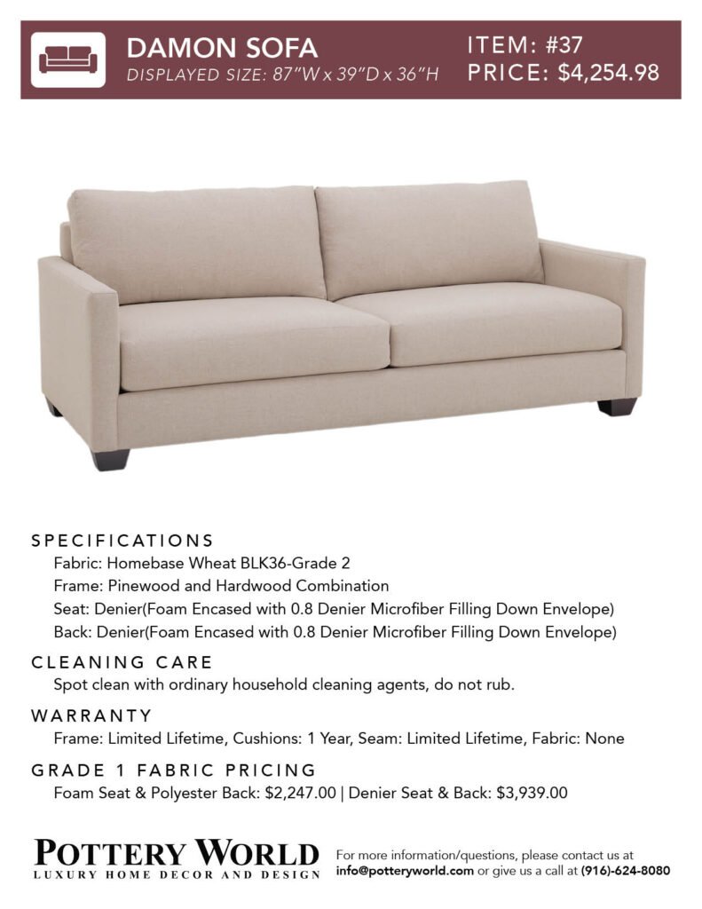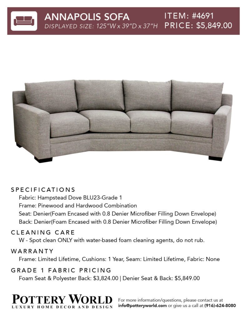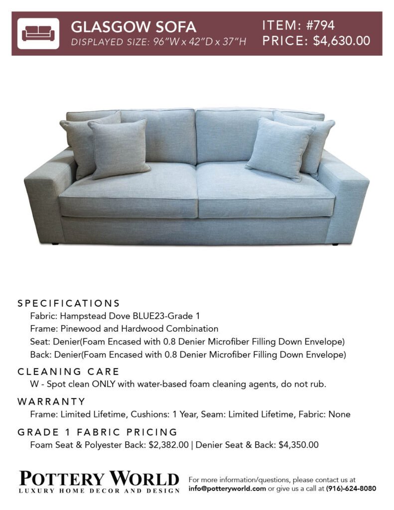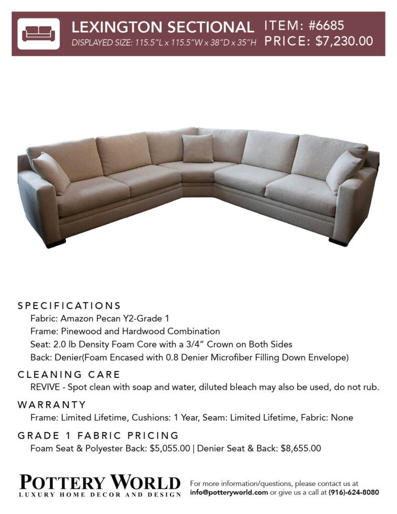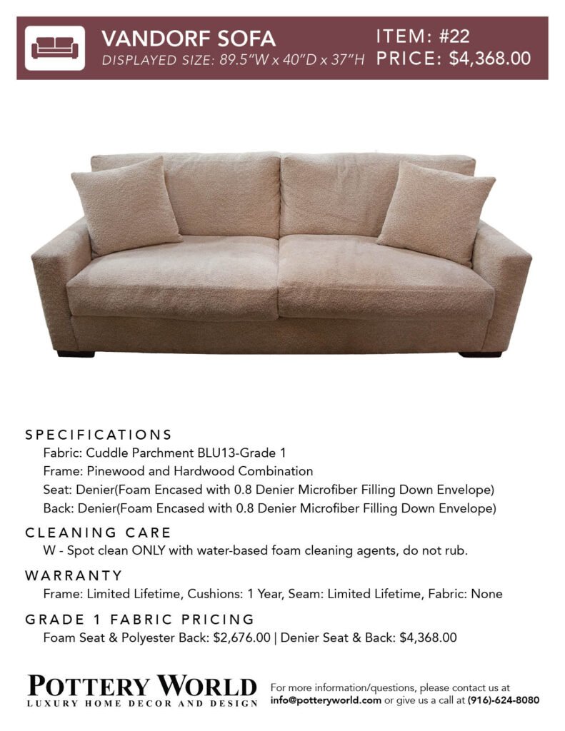 Feel free to reference these info sheets to remember sizing, layout options, pricing differences between denier vs foam(for grade 1) and more for our fabric sofas and sectionals! Simply click the item number(ex: Item #22) to get the pdf for your desired sofa/sectional info sheet. If you have any further questions please send an email to info@potteryworld.com or call at (916)-624-8080.
