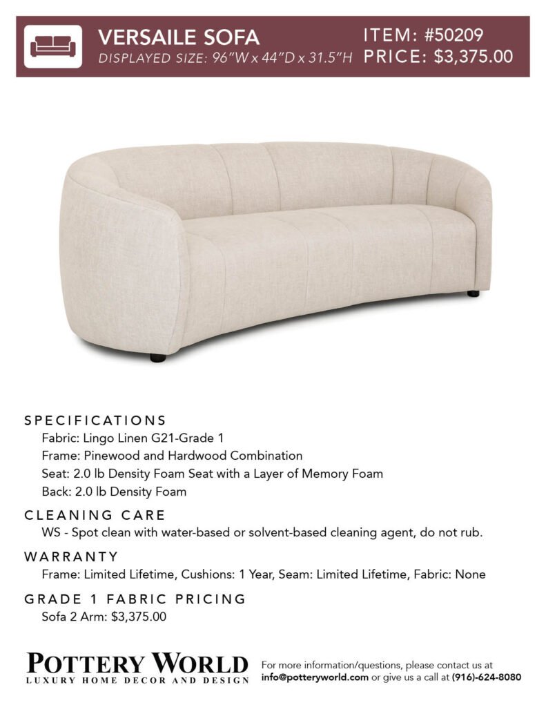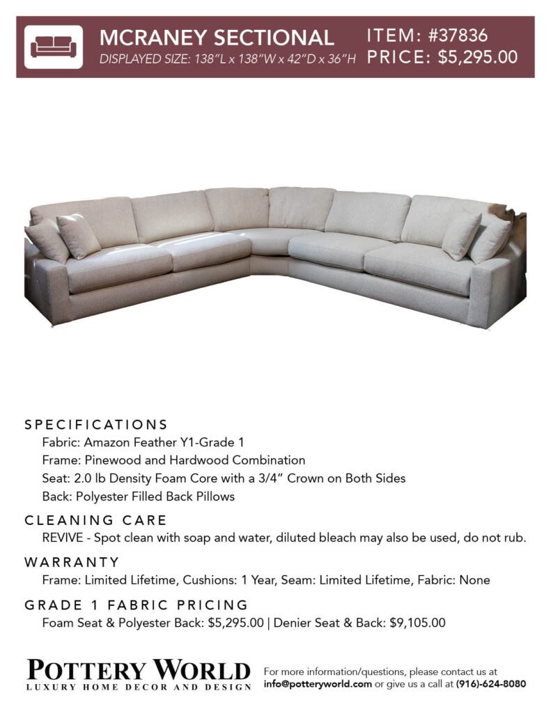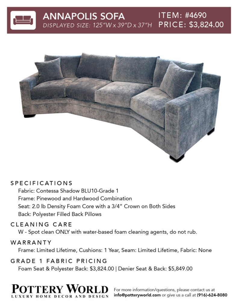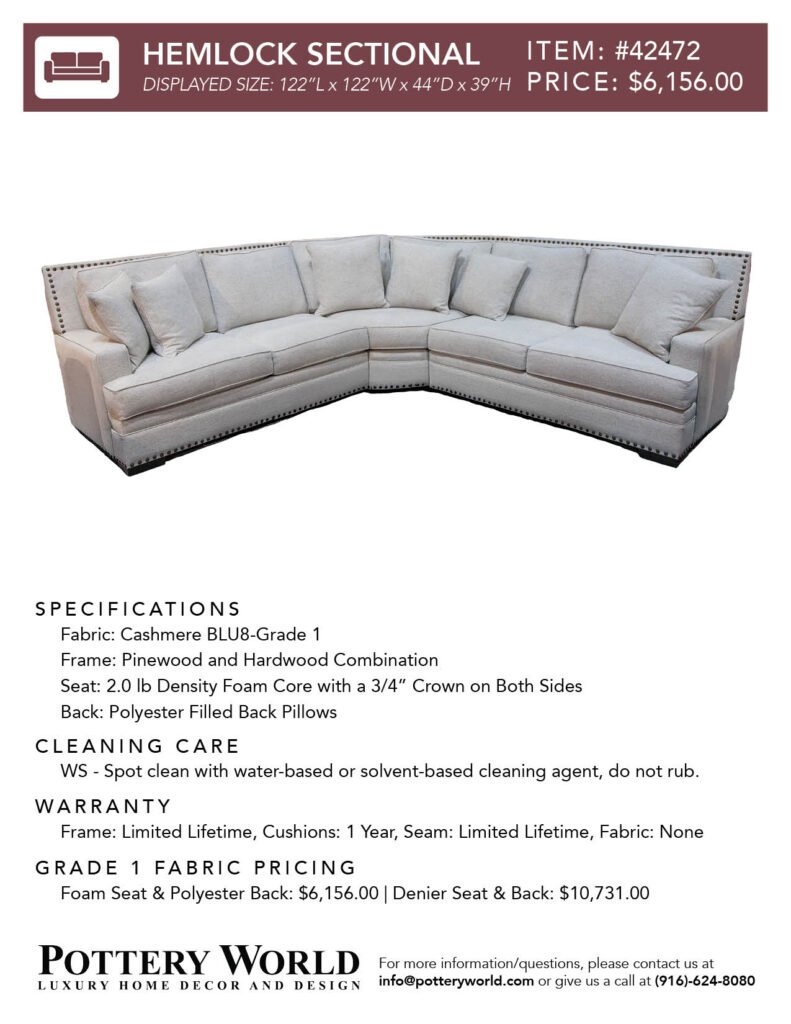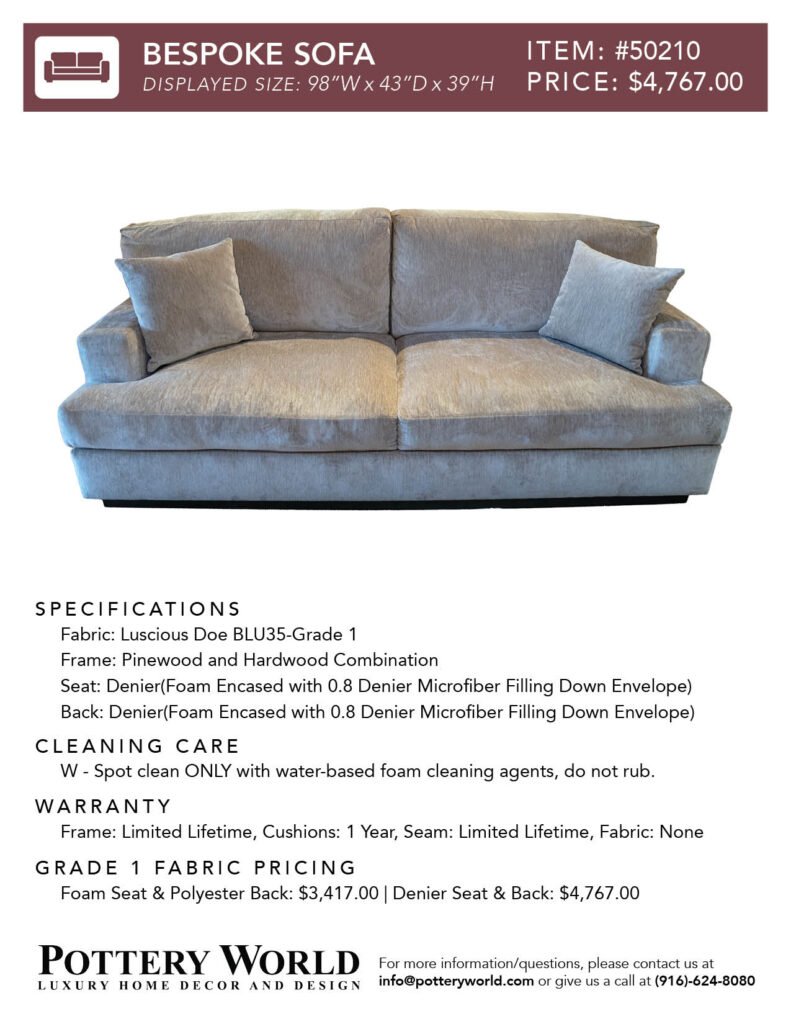 Feel free to reference these info sheets to remember sizing, layout options, pricing differences between denier vs foam(for grade 1) and more for our fabric sofas and sectionals! Simply click the item number(ex: Item #22) to get the pdf for your desired sofa/sectional info sheet. If you have any further questions please send an email to info@potteryworld.com or call at (916)-624-8080.